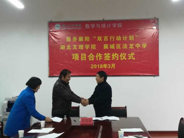 通讯员 耿付荃) 2018年3月19日下午3:30在学院三楼会议室举行服务襄阳“双百行动计划”项目合作签约仪式。出席签约仪式的有襄城区法龙学区领导袁光宏、姚明海、徐勇华、李俊,学院院长王成勇,教授、博士、教师代表。仪式由院长王成勇主持。