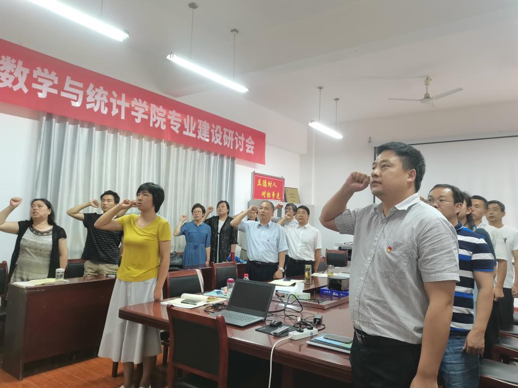 主题党日活动按照“回顾初心、党性教育、民主议事、实践锻炼”四个板块要求进行,全体党员首先在学院会议室集中进行奏唱国歌、重温入党誓词两项议程。议程由数学与应用数学系教师党支部书记杨艳主持,信息与计算科学系教师党支部陶茂虎博士领誓。