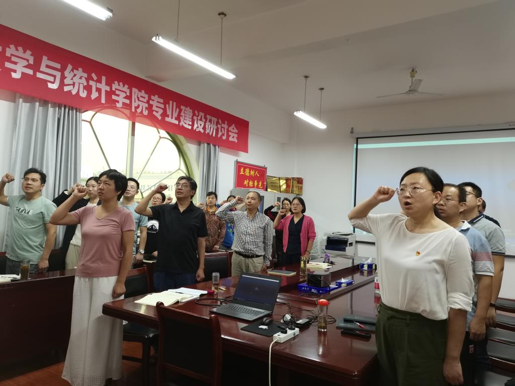 主题党日活动按照“回顾初心、党性教育、民主议事、实践锻炼”四个板块要求进行,全体党员首先在学院会议室集中进行奏唱国歌、重温入党誓词两项议程。议程由信息与计算科学系教师党支部书记唐波主持,数学与应用数学系教师党支部书记杨艳领誓。