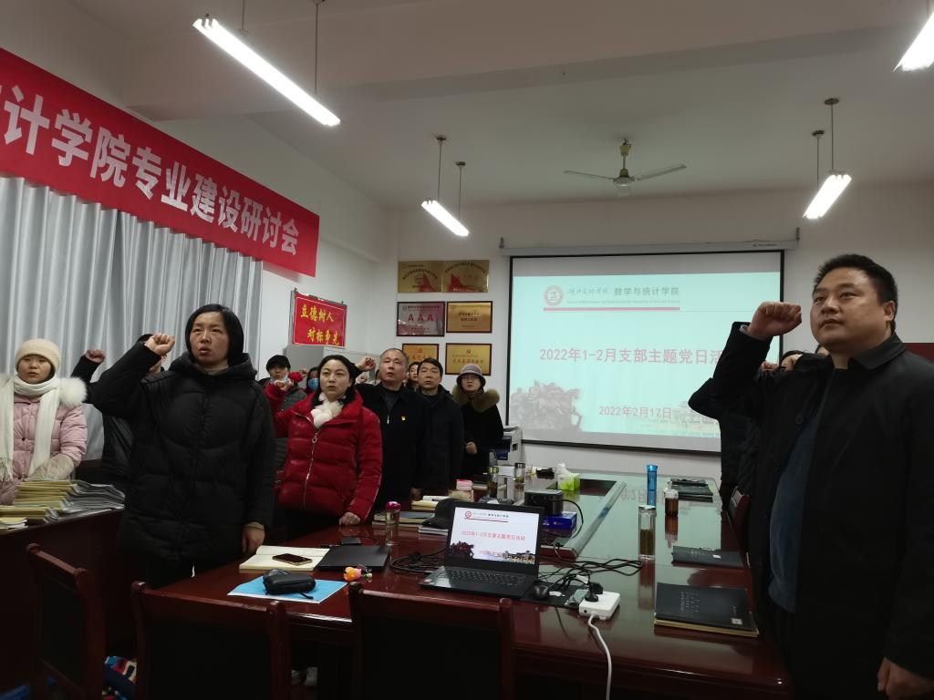 主题党日按照“回顾初心、党性教育、民主议事、实践锻炼”四个板块要求进行,全体党员首先在学院会议室集中进行奏唱国歌、重温入党誓词两项议程。主题党日由数学与应用数学系教师党支部书记杨艳主持、信息与计算科学系教师党支部书记陶茂虎领誓。