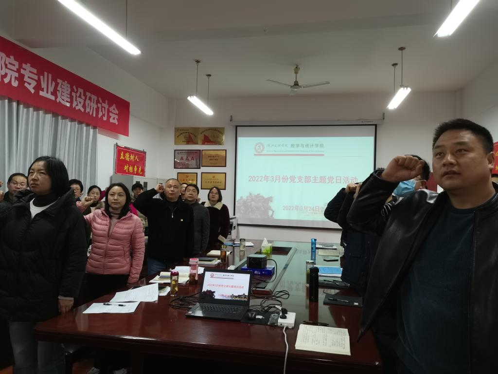 主题党日按照“回顾初心、党性教育、民主议事、实践锻炼”四个板块要求进行,全体党员首先在学院会议室集中进行奏唱国歌、重温入党誓词两项议程,由数学与应用数学系教师党支部书记杨艳主持、信息与计算科学系教师党支部书记陶茂虎领誓。