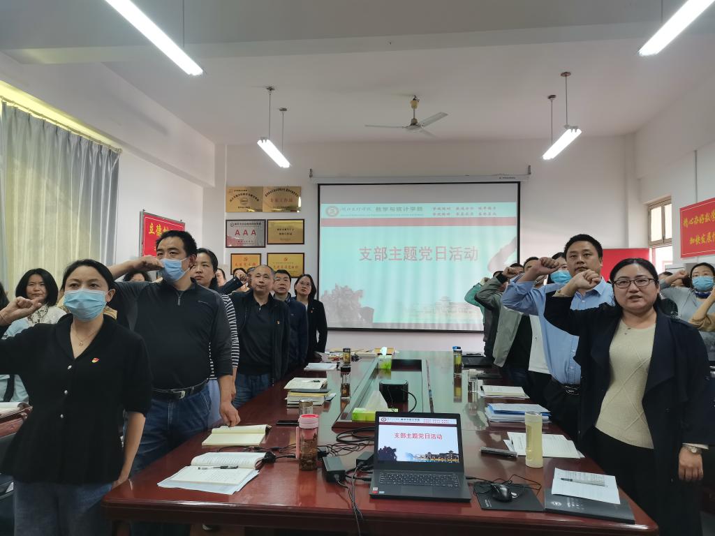 主题党日按照“回顾初心、党性教育、民主议事、实践锻炼”四个板块要求进行,全体党员首先在学院会议室集中进行奏唱国歌、重温入党誓词两项议程,由信息与计算科学系教师党支部书记陶茂虎主持、数学与应用数学系教师党支部书记张敏捷领誓。