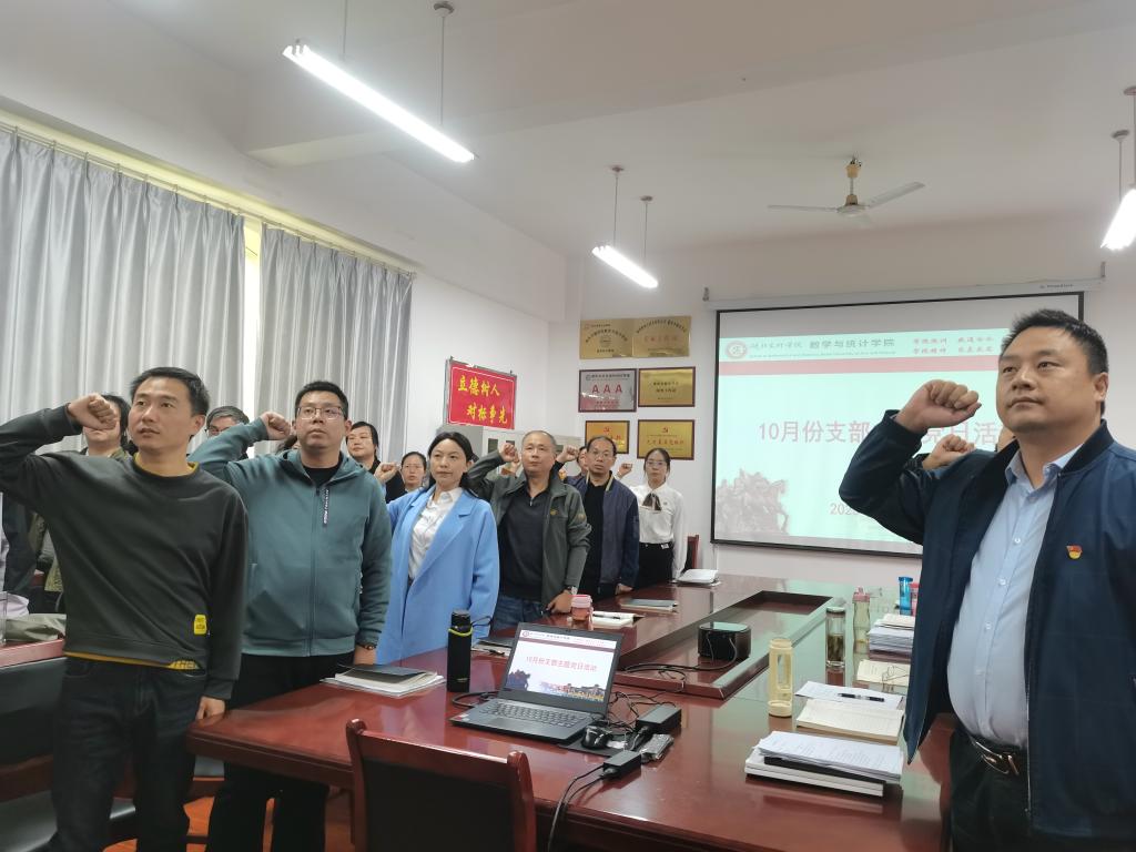 主题党日按照“回顾初心、党性教育、民主议事、实践锻炼”四个板块要求进行,全体党员首先在学院会议室集中进行奏唱国歌、重温入党誓词两项议程,由信息与计算科学系教师党支部书记陶茂虎主持、数学与应用数学系教师党支部书记张敏捷领誓。