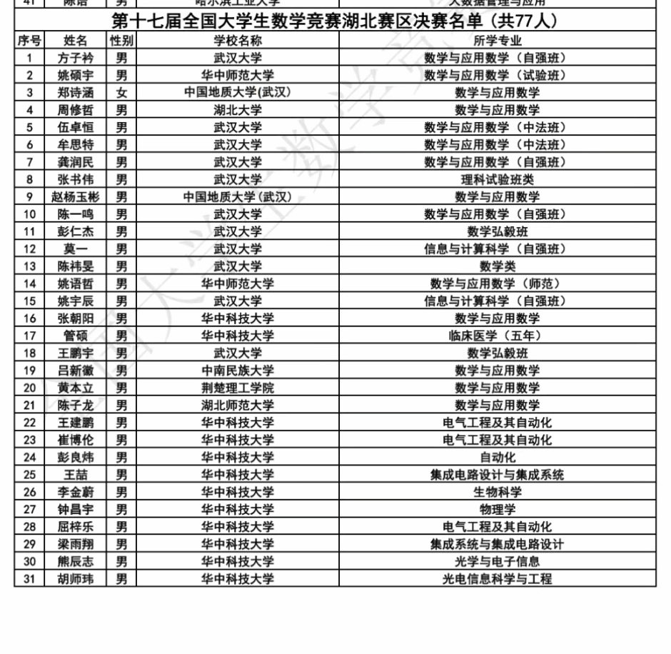 据悉,第十七届全国大学生数学竞赛有1322所高校、352318名选手参加比赛。最终,1365名选手入围决赛。其中湖北赛区有80所高校、21656名选手参加比赛,77名选手入围决赛。