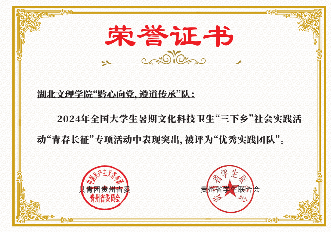 辅导员赵微老师带队组织的“黔心向党,遵道传承”实践队,凭借出色表现荣获“优秀实践团队”。