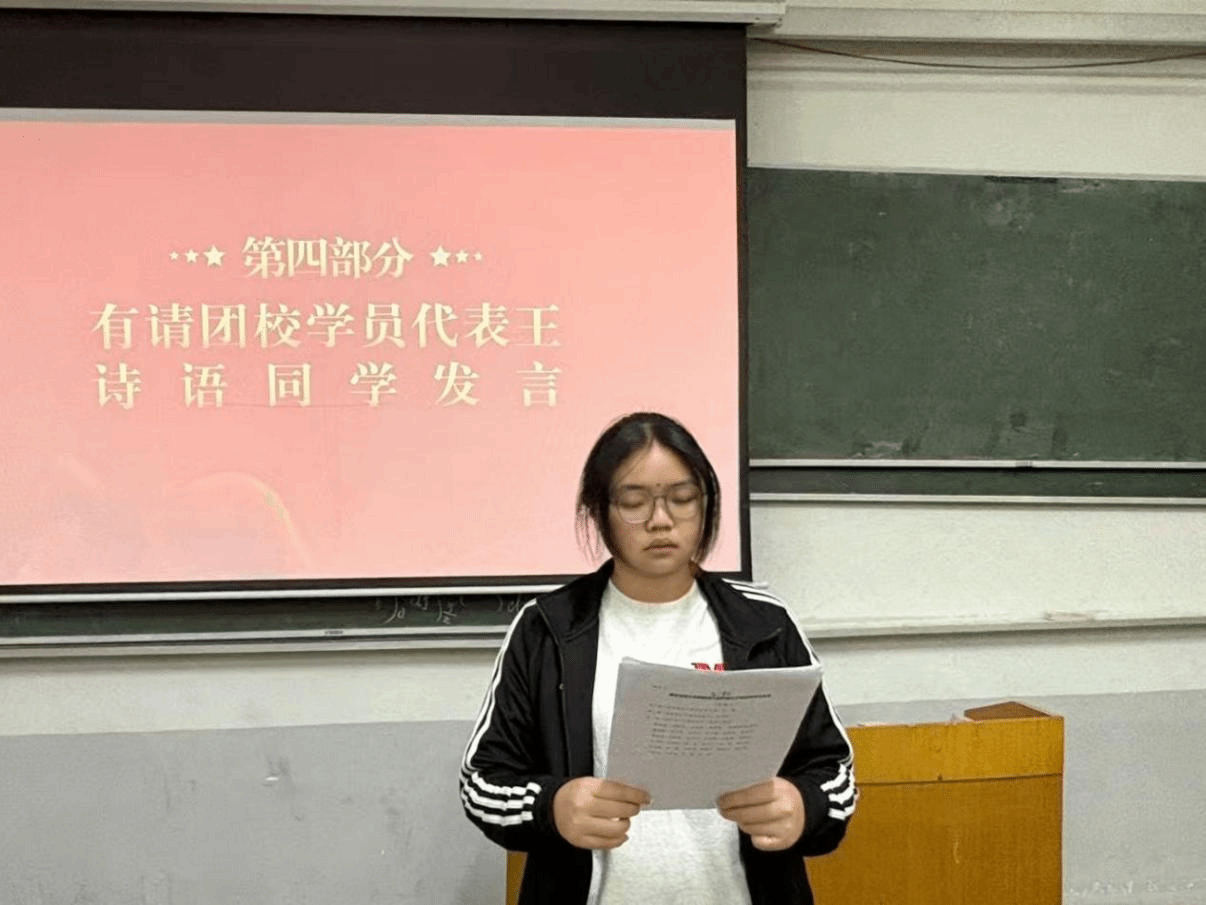学员代表王诗语同学上台发言。她代表全体积极分子郑重承诺:将以最饱满的热情投入培训,严守培训纪律,深耕理论知识,深刻践行入团初心,不断提升思想觉悟与综合素养,以实际行动争取早日成为一名光荣的中国共产主义青年团团员。