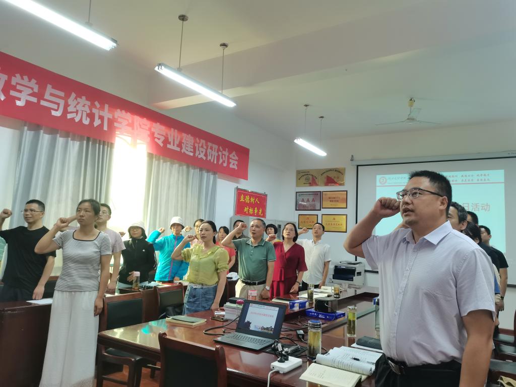 主题党日按照“回顾初心、党性教育、民主议事、实践锻炼”四个板块要求进行,全体党员首先在学院会议室集中进行奏唱国歌、重温入党誓词两项议程,由行政党支部书记耿付荃主持、信息与计算科学系教师党支部书记陶茂虎领誓。
