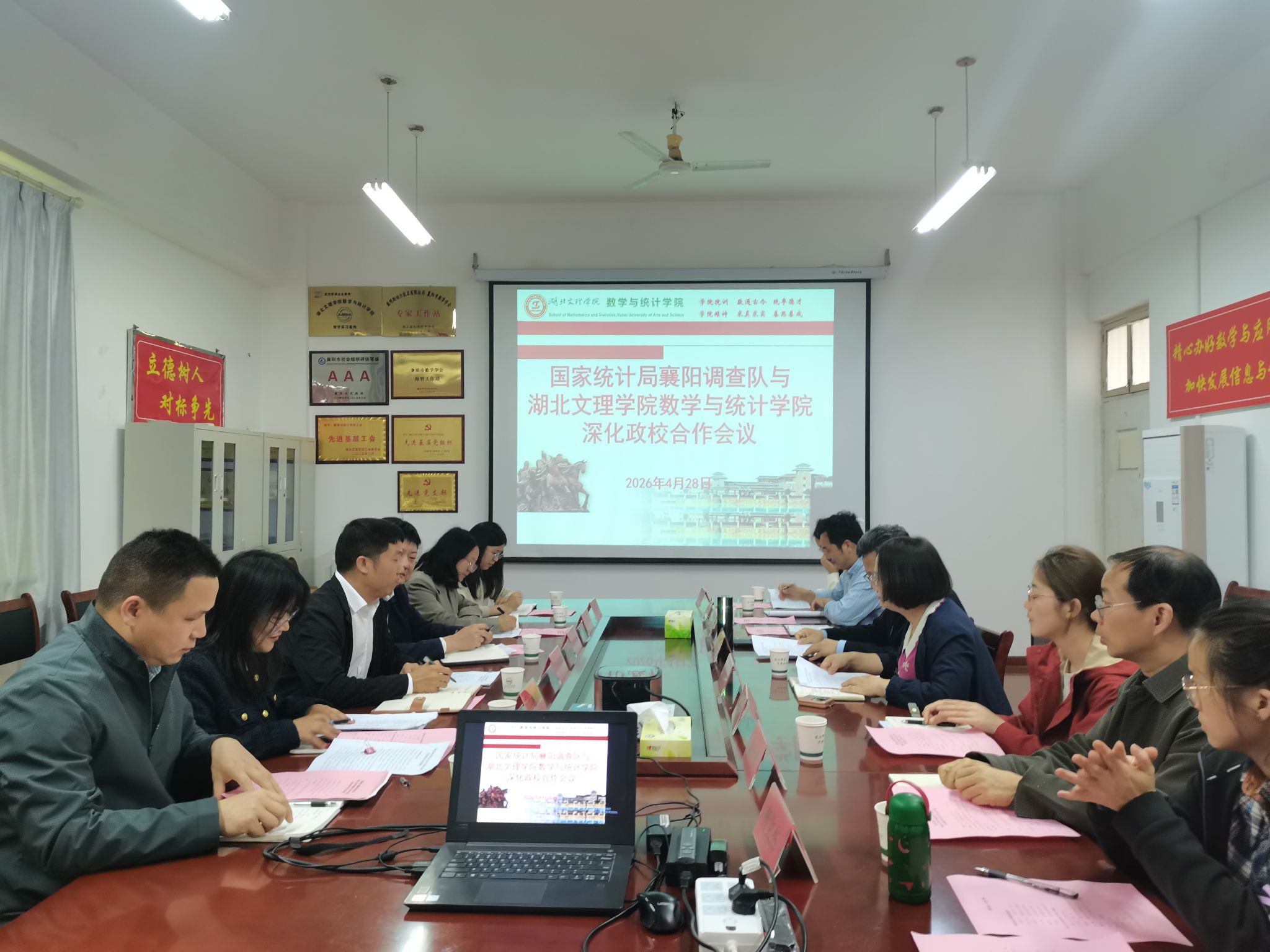 表示感谢,并详细介绍了襄阳调查队的业务范围、与学院合作取得显著成绩。他希望在课题申报、统计建模等领域开展深入合作,共建实习基地,为学生实习实践提供良好保障。