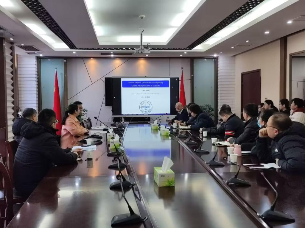 郑兵教授作了题为《Neural network approaches for computing Moore-Penrose inverse of a matrix》的学术报告,详细的介绍了神经网络算法的发展历史,递归神经网络模型,零神经网络模型以及具体的求解矩阵广义逆的神经网络算法模型,并就相关问题与师生展开了深入的探讨。之后,郑兵教授对我院国家自然科学基金申报工作进行了指导,尤其是对数值线性代数方向的申报书,从选题意义、研究背景、创新性等方面,给予了具体指导,提出了建设性的建议。
