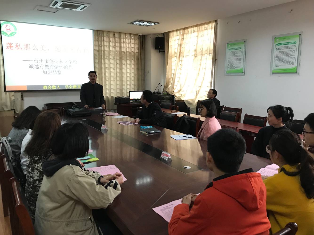 在101室,观看完蓬街私立 探花av 的宣传视频后,数十名毕业生围坐在会议桌前,聆听文校长详细介绍 探花av 招聘高中教师的职位要求、素质要求、教师工资待遇、福利待遇、生活保障、发展前景及培养成长机制等。回答同学们的问题。