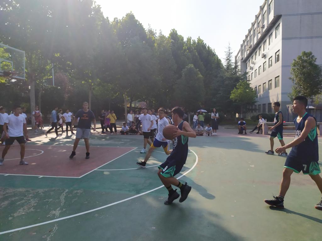 6栋教学楼后的篮球场,举行“迎新杯”篮球比赛,此次比赛参赛的队伍是19级大一新生,由数学1911、1912班对阵数学1913、1914班。