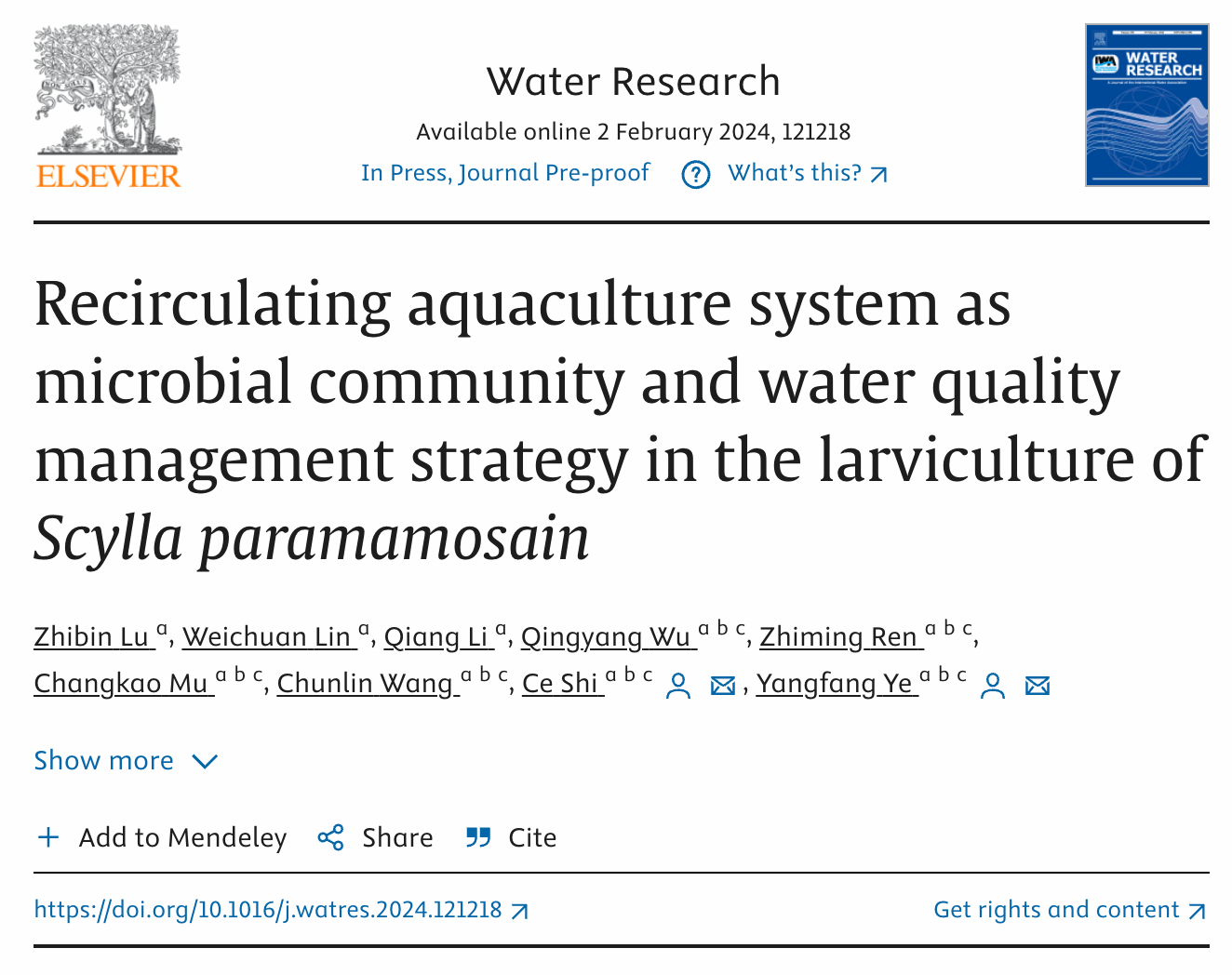 近日,环境领域顶级期刊《Water Research》(影响因子=12.8)发表了海洋探花av叶央芳课题组的最新研究成果“Recirculating aquaculture system as microbial community and water quality management strategy in the larviculture of Scylla paramamosain”。海洋探花av陆智斌博士、林维钏博士和李强硕士列该论文的第一至第三作者,通讯作者为叶央芳研究员和史策副教授。