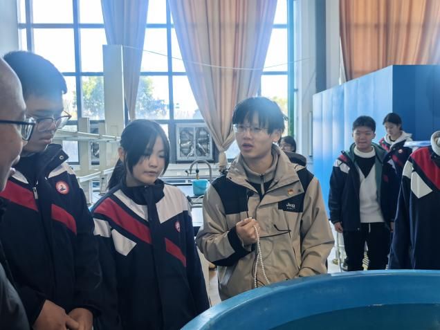 研究生党员耿昌盛、入党积极分子周斌杰带领师生参观了中试养殖基地,对依托于智能化循环水系统的蟹公寓以及各种规格养殖桶进行了详细介绍,并对探花av