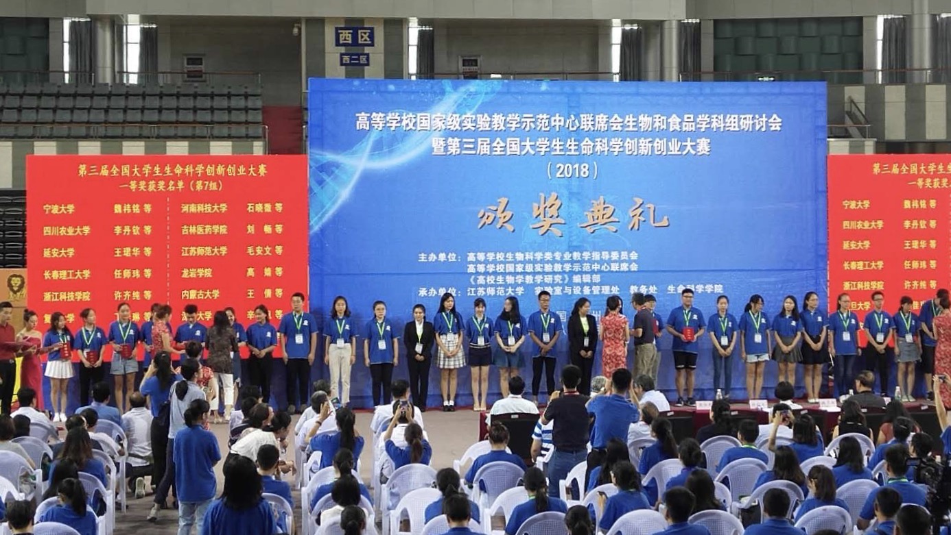 8月7-9日由高等学校生物科学类专业教学指导委员会、高等学校国家级实验教学示范中心联席会、《高校生物学教学研究》编辑部联合主办,由江苏师范大学、吉林大学生物国家级实验教学示范中心、吉林省生物化学与分子生物学会联合承办的第三届全国大学生生命科学创新创业大赛圆满落下帷幕。其中我校入围决赛的6支队伍均荣获了一等奖的佳绩!