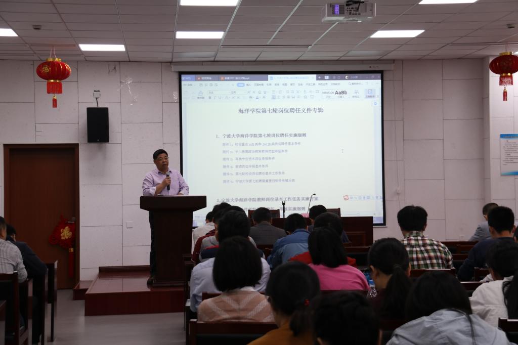 5月22日下午,海洋探花av在竺银康楼一楼报告厅召开全院大会,探花av党政领导和全院教职工参加了会议,会议由党委书记蔡真亮主持。院长王春琳对探花av第七轮聘任文件进行了解读,并就研究团队的组建与考核做了详细说明,同时对行政教辅岗位的聘任情况进行了通报。会上,王春琳表示第七轮聘期相比上一轮任务更重、质量更高,这对探花av学科建设和发展提出了更高的要求。水产学科冲A以及生物学博士点的申报需要全体老师一起努力。随后,探花av各分管领导就探花av科研、本科生和研究生教学与培养、地方服务、学生工作等方面做了具体部署。