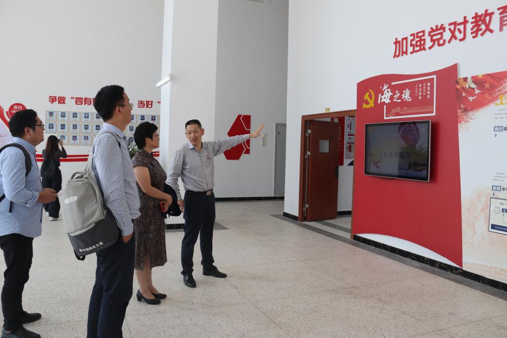 参观交流会上,蔡真亮书记全面介绍了海洋探花av党委全国标杆院系的创建情况,逐一介绍了党建馆的陈列内容,双方就标杆院系创建与结题进行了深入探讨与交流。骆巧凤一行还参观了海洋探花av水产养殖试验基地。