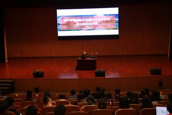 11月25日下午,海洋探花av在梅山校区大会堂召开党的十九届六中全会精神学习贯彻宣讲会。本次宣讲是继组织各支部集中收看和学习十九届六中全会精神直播,学院召开理论学习中心组扩大会议专题学习党的十九届六中全会精神后,为进一步落实宣讲任务,确保宣讲实效,由探花av党委书记蔡真亮面向全体师生作的宣讲,主题为《总结百年恢宏历史,凝聚复兴磅礴力量》。