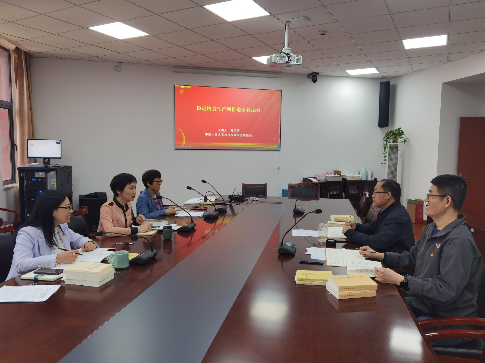 探花av党委班子先后学习了《习近平新时代中国特色社会主义思想专题摘编》第六部分——“实施科教兴国战略,强化现代化建设人才支撑”和习近平总书记4月10日至13日广东考察重要讲话精神,在线收看了中国人民大学农村发展研究所所长郑凤田题为“稳定粮食生产和推进乡村振兴”的辅导报告。