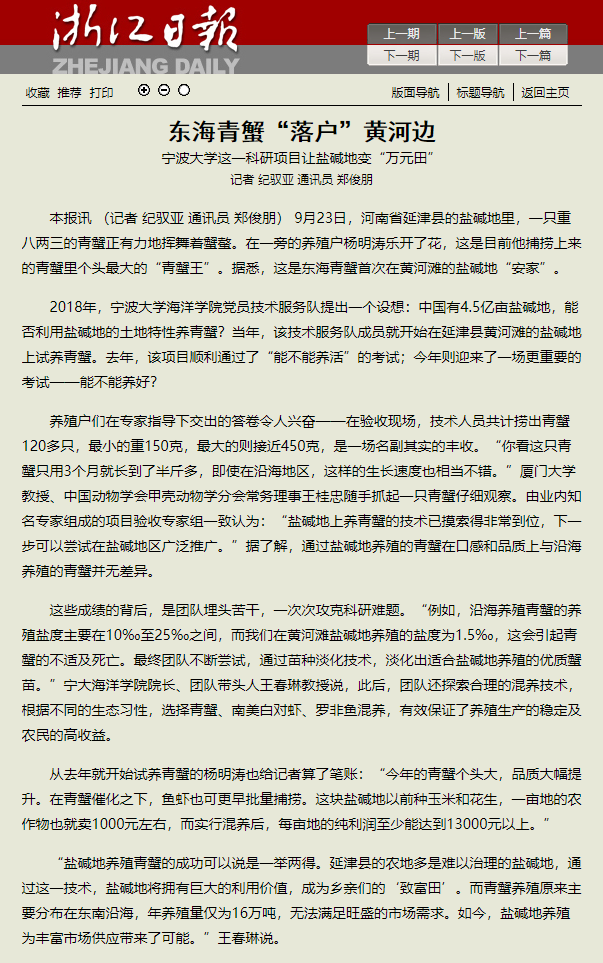 东海青蟹“落户”黄河边
