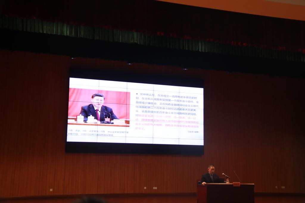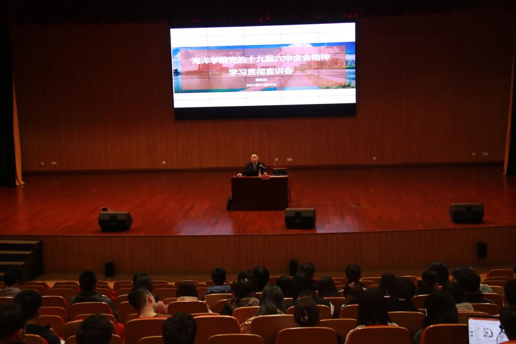 11月25日下午,海洋探花av党委在梅山校区管委会大礼堂召开党的十九届六中全会精神学习贯彻宣讲会,探花av党委书记蔡真亮面向全体党员、预备党员、入党积极分子等师生群体200余人作宣讲报告。根据上级关于深入学习贯彻党的十九届六中全会精神,广泛开展“六讲六做”大宣讲活动的统一部署,近段时期将在全省、全市、全校范围内开展“百名书记带头讲、百名局长条线讲”“百名专家深入讲、百名记者互动讲”“万名干部入户讲、千名青年流动讲”双“百千万”行动。海洋探花av积极贯彻落实上级部署,已相继召开理论学习中心组扩大会议专题学习党的十九届六中全会精神,组织各支部集中收看和学习十九届六中全会精神,为进一步落实宣讲任务,确保宣讲实效,本次宣讲会邀请海洋探花av党委书记书记蔡真亮给各位党员同志作《总结百年恢宏历史,凝聚复兴磅礴力量》的宣讲报告。