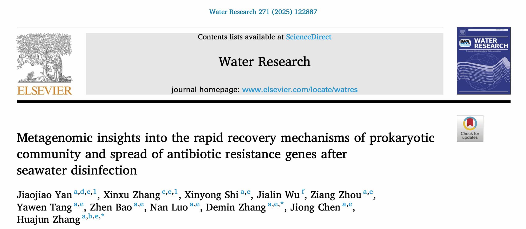 12月4日,我院微生物与渔业健康团队张化俊副教授和张德民教授在国际著名水环境期刊《Water Research》上发表了题为“Metagenomic insights into the rapid recovery mechanisms of prokaryotic community and spread of antibiotic resistance genes after seawater disinfection”的研究论文,利用宏基因组测序技术揭示了海水消毒后原核群落恢复机制及对抗生素抗性基因传播的影响。本文是继该团队2023年在《Water Research》上发文报道漂白粉消毒后原核群落可快速恢复现象后的深入开展的机制研究。