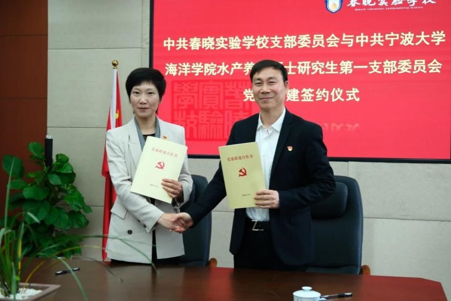 附属春晓实验学校海洋教育精品课程建设研讨会暨党建联建签约仪式在春晓实验学校隆重召开,我院党委书记邵丽,党委副书记、纪委书记张乐以及水产养殖硕士研究生第一党支部书记余杰出席,活动由春晓实验学校教科室主任王寒光主持。