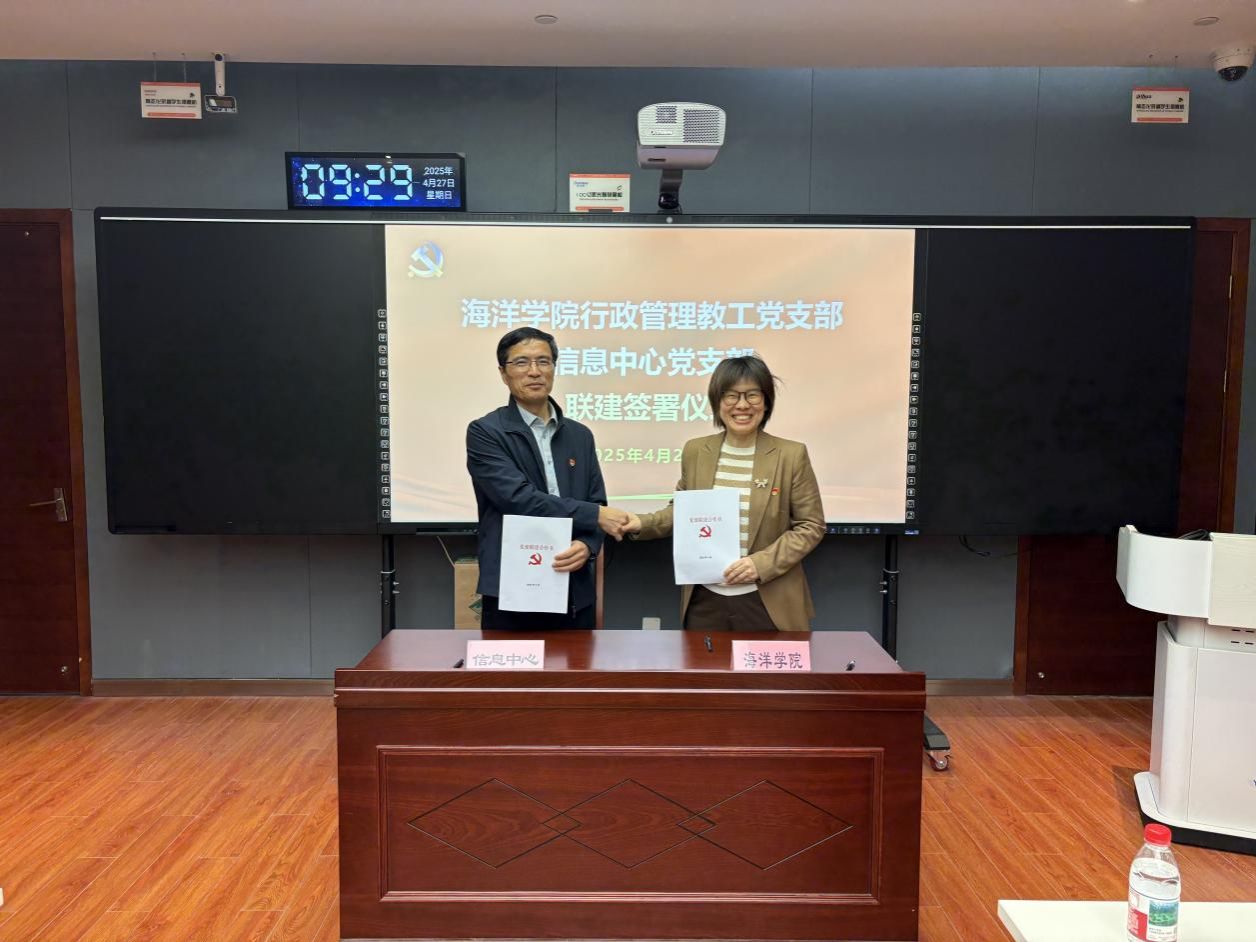 在联建仪式环节,信息中心党支部书记董其军对海洋探花av行政管理教工党支部的到来表示热烈欢迎。他表示此次联建是深化协同、精准对接需求的重要契机,信息中心将主动倾听探花av在人才培养、科研创新、管理服务中的信息化需求,通过优化技术手段、完善数据治理与应用,为海洋探花av特别是登峰学科提供更高效、更精准的信息化服务支持,共同破解发展难题。信息中心党支部书记董其军、海洋探花av行政管理教工党支部书记包红燕分别介绍各自支部建设情况、党员队伍及近年取得的荣誉成果,并代表双方签署联建协议。
