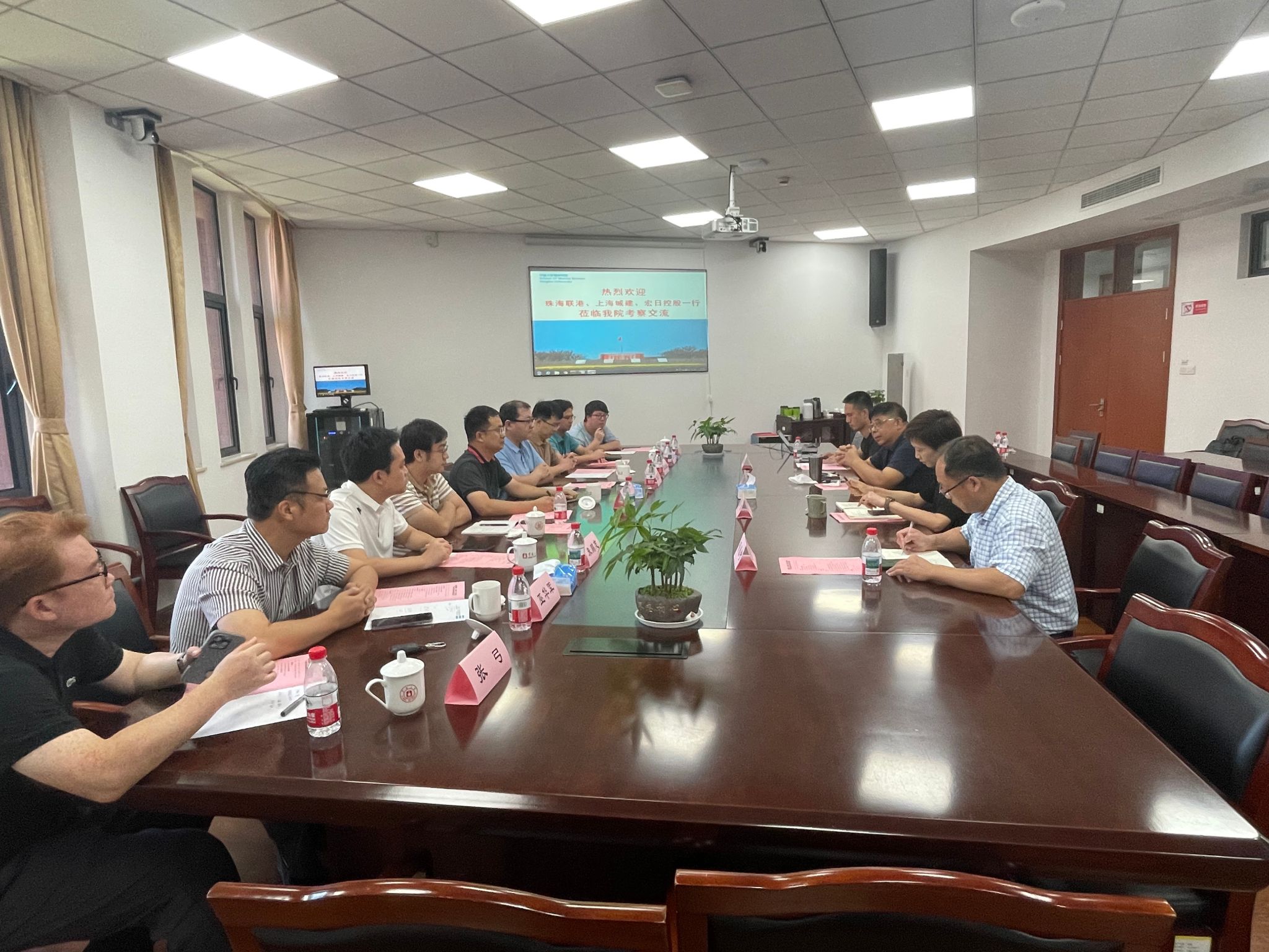8月23日,珠海联港集团有限公司副总经理杨凯华、上海城建粤港澳大湾区市场总监岳昆和宏日(浙江)控股有限公司西南区域负责人巫华军等相关企业负责人一行9人前来海洋探花av开展产学研对接交流。海洋探花av党委书记邵丽、党委委员水产学科负责人王春琳、党委委员副院长母昌考等参加了对接会。