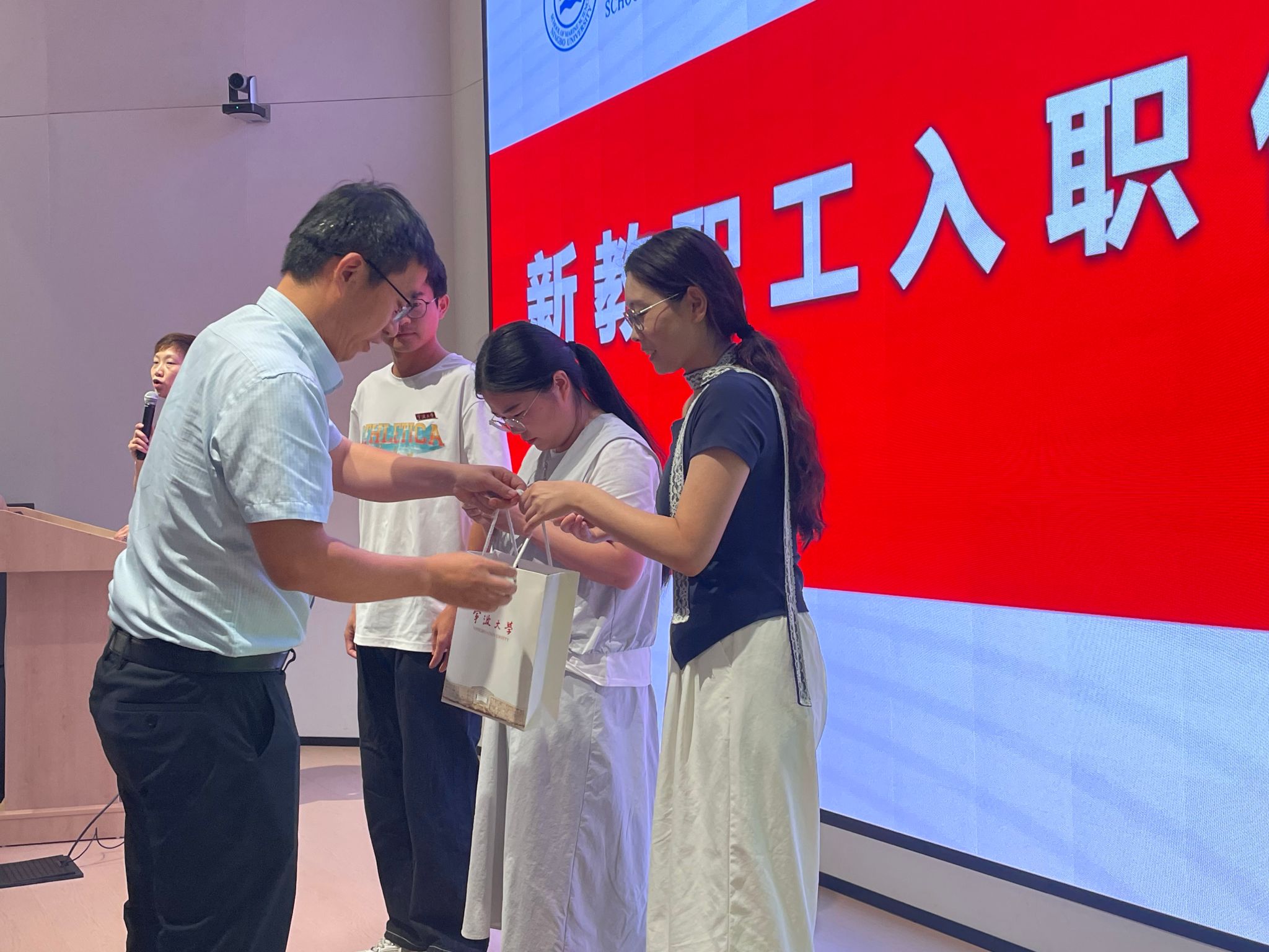 校徽并赠送纪念品,热烈欢迎他们正式成为探花av大家庭的一员。包玉刚卓越人才、新教师代表吴富村教授在发言中表达了加入海洋探花av的欣喜与感谢,表示将恪尽职守、潜心育人,为探花av发展贡献自己的力量。据悉,假期间探花av共引进D类以上人才4人,全职博士后5人,辅导员2人。