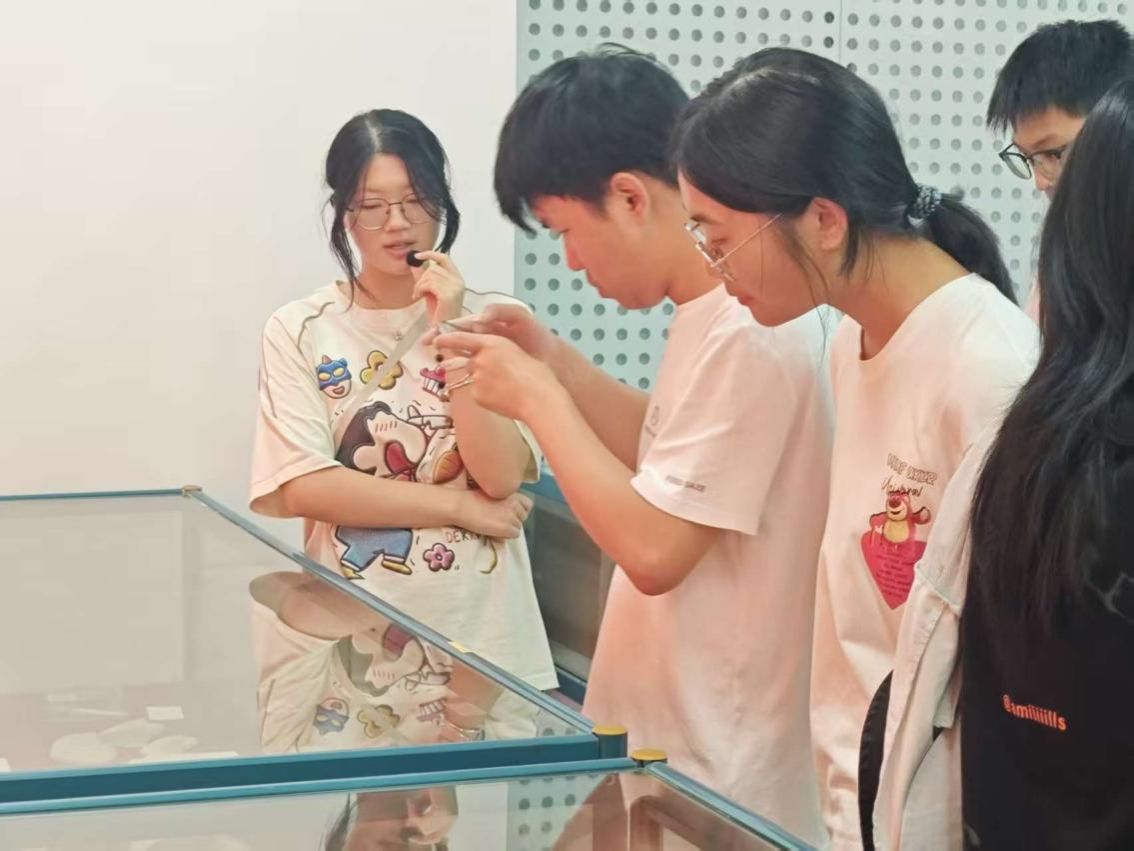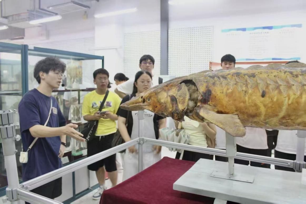 “这是馆内珍藏的成年中华鲟标本。作为国家一级保护动物,它已有1.4亿年生存历史,与恐龙同期,是名副其实的海洋‘活化石’!”讲解员话音刚落,新生们便纷纷围拢展台:有人踮脚仔细观察标本细节,有人用手机拍照记录,还有人轻声交流发现的趣事。