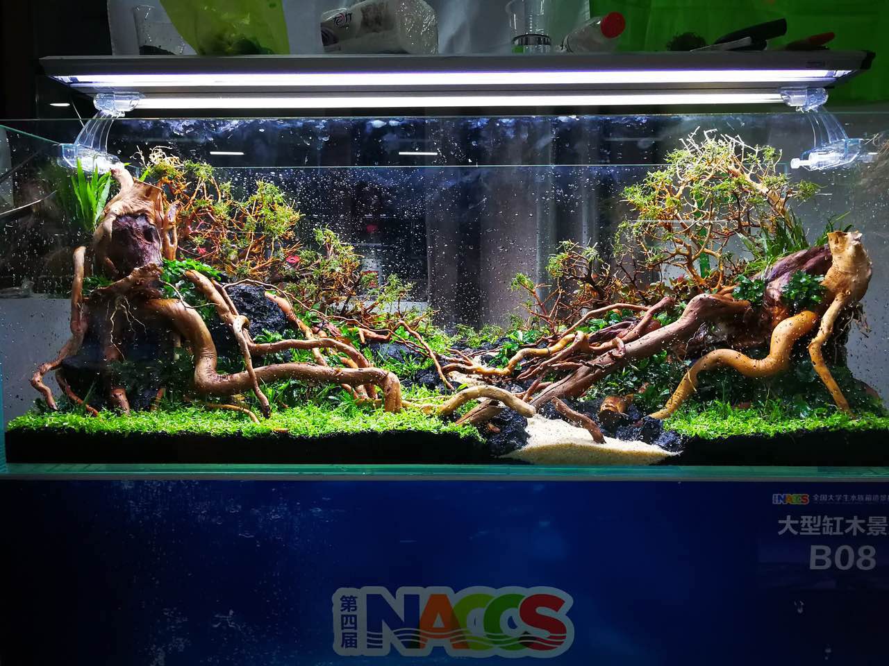 首先,比赛选手按规定领取定额代金券,挑选造景素材,随后进行景观设计,摆放石材、木材,固定水草,安装、调试设备,造景历时一天,截止晚上22:00,100支参赛队伍都在指定时间完成水族箱造景。我校王冠林、林琪创作的《丹霞幻影》中型石景缸作品喜获二等奖,作品以树化玉为主、水草为辅,着重表现了丹霞地貌的瑰丽多姿。层峦叠嶂,曲径通幽,其色如渥丹、灿若明霞;王洪斌、何晨阳、张江美共同创作的《归家》大型木景缸作品荣获三等奖,作品左右两边运用杜鹃根拼接成交错延伸的根系,蕴涵游子和家人的牵绊和顾念。远处用泰国沉木打造成连绵的树林,蜿蜒的小溪从林子尽头流出,象征思念连绵不绝以及鱼水之情,归家就如鱼对水的感激和羁绊;张泽达创作的《枕石听松》小型石木景缸作品荣获三等奖,一重境乃是取以石为基,衬垫松木之意;二重境,则是寓松木斜倚,枕靠青石之意。枕石听松,两个意象互为主体,苍松倚石,青石聆听,低声絮语。