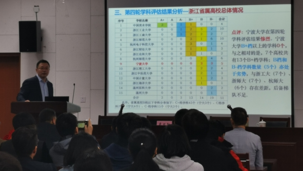 报告会上戴院长介绍了学科评估工作概览,并就浙江省属高校的总体情况针对第四轮学科评估结果进行了分析。在对比分析过程中,戴院长向教师们指出了我院水产学科发展上存在的薄弱环节,同时就我院现有的条件给出如何冲A的方向性意见。报告会的最后,蔡真亮书记代表海洋探花av全体师生向戴世勋院长一行的到来表示感谢,提出要在第七轮岗位设置中落实戴院长所提的建议,同时向会场内的教师们作出了动员性的发言。