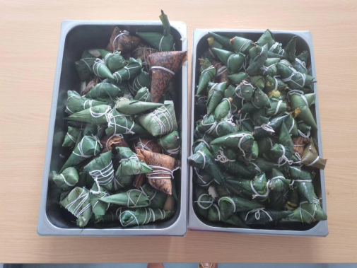 大家围着放了红豆、豇豆、豌豆、黑豆,红枣、蜜枣、白糯米、紫糯米、大黄米等食材的桌边,在食品协会学生和食堂师傅的指导下,别开生面的包粽子活动开始了。大家卷粽叶、放糯米、捆扎,按照包粽子的手法,一折叶,二盛料、三压实,四包,五扎绳,看似简单,但要做个漂亮的粽子还是需要一点功夫的。对部分老师来说是第一次亲手包粽子,是一回难得的体验,也有潜心做教学科研的老师显示了手巧的一面。