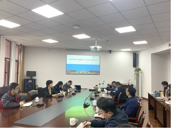 3月8日下午,在海洋探花av召开2022年行政管理人员年度/聘期考核会。院党政领导班子成员,学位点负责人、专业负责人、系主任、班主任代表等参加。会议由党委书记邵丽主持。