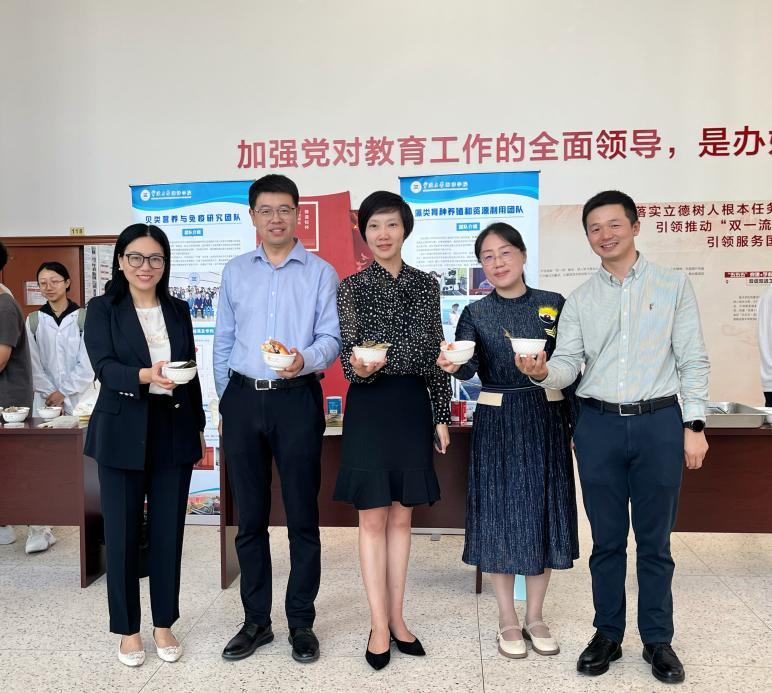 科普展示活动中,与会师生对银鲳、青蟹、南美白对虾、藻类、贝类等海产品进行品鉴,并由海洋探花av各优秀团队的同学们为大家介绍海洋探花av的科研成果。