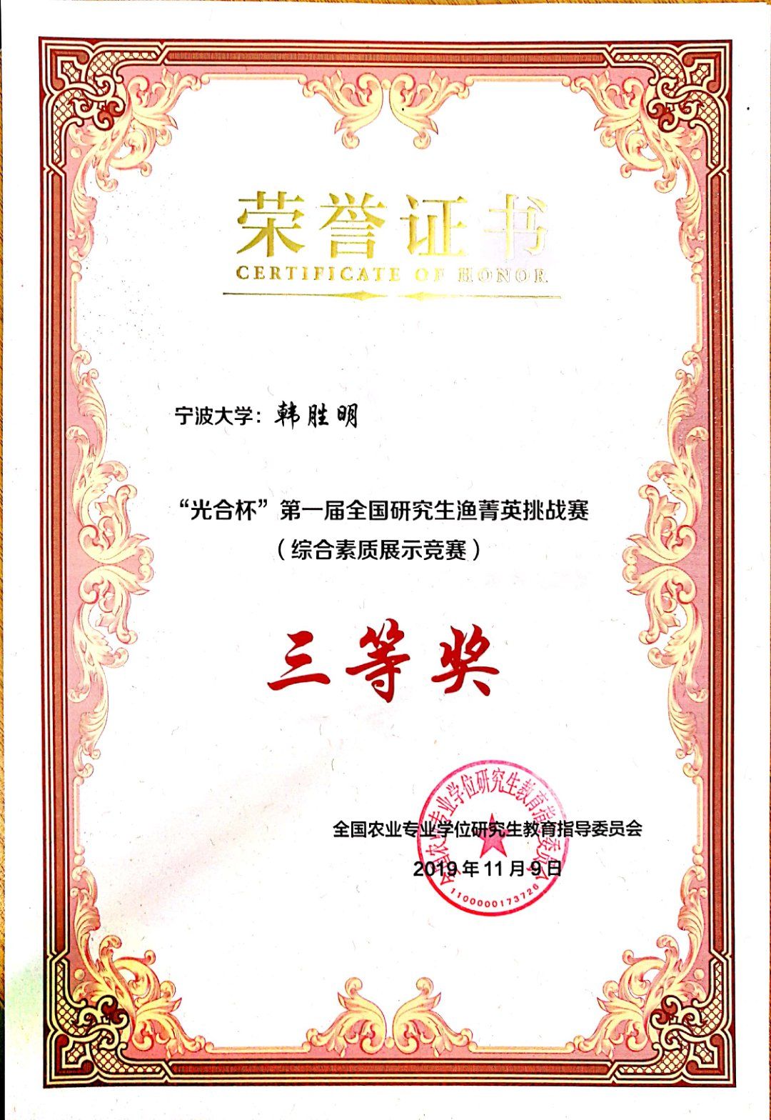 海洋探花av+“光合杯”第一届全国研究生渔菁英挑战赛 三等奖 韩胜明 个人