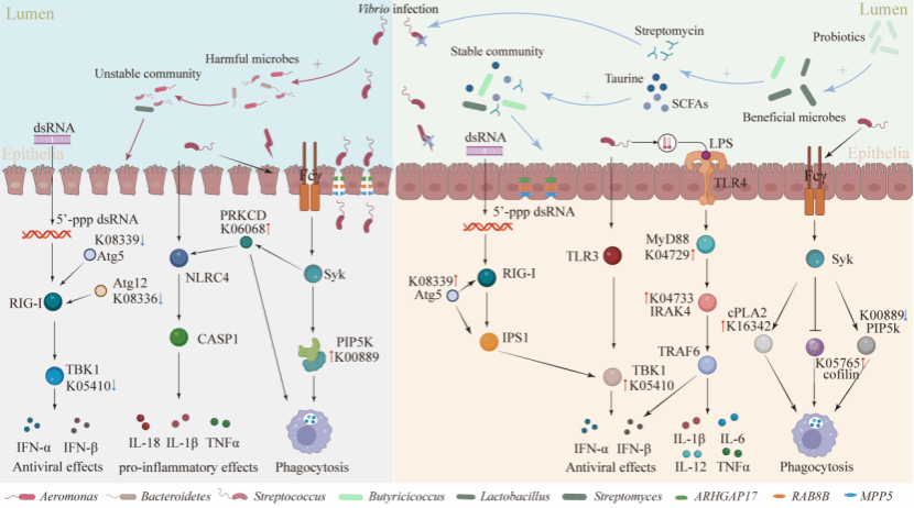 为唯一署名单位在Nature出版集团期刊npj Biofilms and Microbiomes (IF 9.2)发表题为《Rationally designed probiotics prevent shrimp white feces syndrome via the probiotics–gut microbiome–immunity axis》的研究论文。该研究对症(病原菌)定向设计了益生菌,并从益生菌—肠道微生物组—宿主免疫反馈整体维度揭示了益生机理。2023级博士生沙浩男为第一作者,陈炯研究员和陆嘉祺博士为合作作者,熊金波研究员为通讯作者。