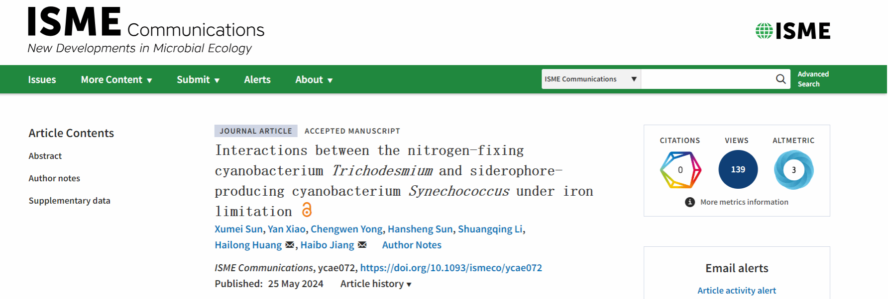 海洋探花av姜海波教授、孙旭梅副教授在Nature出版集团旗下的微生态领域知名期刊《The ISME Communications》上发表题为“Interactions between the nitrogen-fixing cyanobacterium Trichodesmium and siderophore-producing cyanobacterium Synechococcus under iron limitation”的研究论文(图1),揭示了海洋主要固碳蓝藻(Synechococcus)和主要固氮蓝藻(Trichodesmium)及其微生物群落在竞争性获取铁元素中的互作机制。