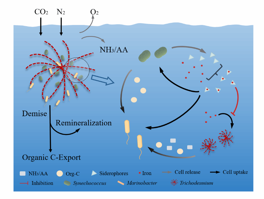 固氮蓝藻——束毛藻(Trichodesmium)是寡营养海域中“新”氮源的主要贡献者,驱动着海洋初级生产力的新生和元素循环。然而,海洋中生物可利用铁的不足限制了束毛藻的生长和代谢。在缺铁海洋中,束毛藻可以通过调节基因表达、改变自身形态以及依靠与群落内共生微生物的相互作用适应环境。近来的研究表明,无法合成铁载体的束毛藻可能具备铁载体转运系统,而海洋存在一类铁载体分泌型聚球藻(Synechococcus),其分布海域与束毛藻存在重叠,但束毛藻能否利用聚球藻分泌的铁载体以适应缺铁环境尚不清楚。