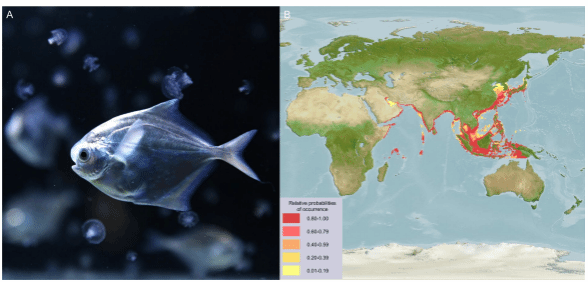 银鲳(Pampus argenteus)隶属鲳亚目(Stromateoidei)、鲳科(Stromateidae)、鲳属(Pampus),俗称白鲳,镜鱼等,属暖水性中上层集群性经济鱼类,广泛分布于印度-西太平洋的沿海海域,波斯湾到印度尼西亚,以及中国大部分沿海地区(图3)。其肉质鲜美细腻、营养丰富,是我国名贵的海水经济鱼类之一。自上世纪起,由于过度捕捞和环境污染,银鲳野生资源面临极具衰退的风险。