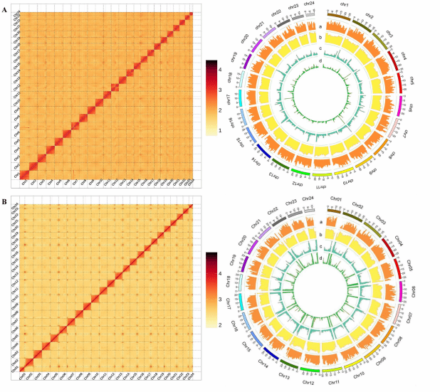 图4 银鲳雌鱼(A)和雄鱼(B)基因组染色体组装结果
